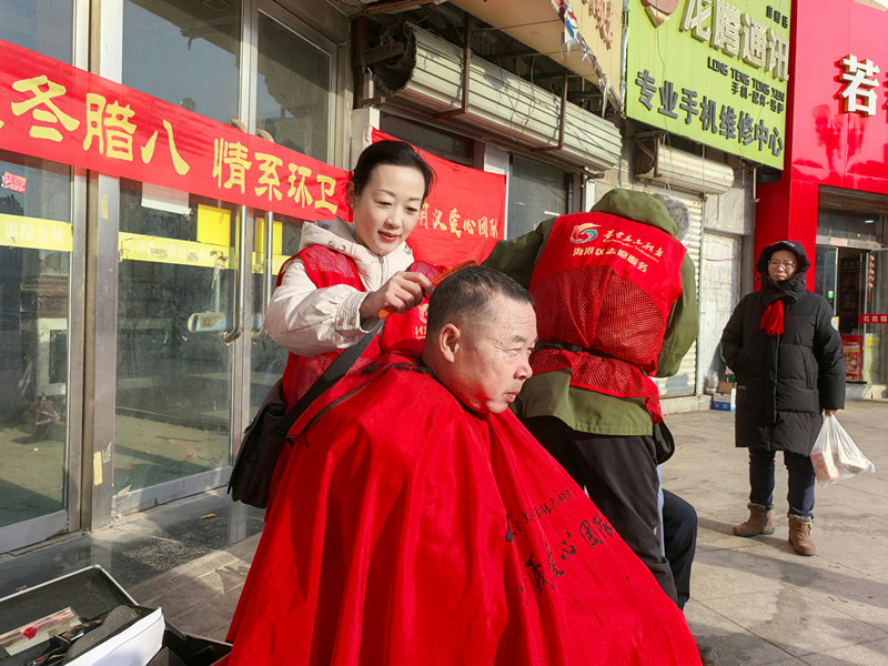 此外,党员们还参与义剪环节。在理发师指导下,大家为环卫工人围上围布,装上合适的卡尺,从发前到发后、耳旁到头顶,精心修剪出整洁的发型。理发后的环卫工人精神焕发,纷纷点赞。