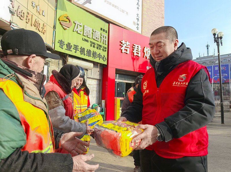 紧接着,党员们将加绒保暖手套递到环卫工人手中,每双手套的绒面在阳光下泛着暖意。当手套被交到环卫工人皲裂的手掌上时,双方笑容同时绽放——党员的笑容透着真诚关怀,环卫工人的笑容满是质朴感激,两排身影在寒风中交织成温暖的画卷。
