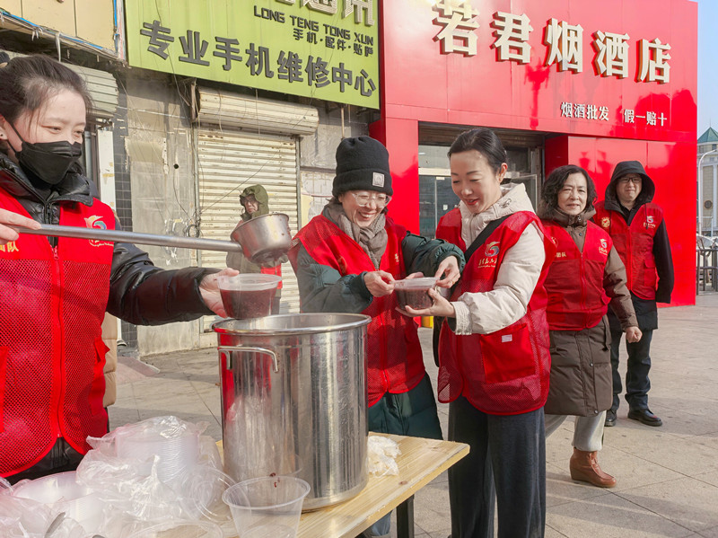 活动当天清晨,太阳城天洋西厅广场寒意袭人,却因玻机党员与党义志愿者的身影而暖意渐浓。党员们身着红马甲分工协作:搬运粥桶、舀粥入盒、送粥到人。粥桶蒸腾的白雾裹挟着桂圆与糯米的甜香,在冷空气中袅袅升腾。环卫工人们捧着热粥,小心翼翼地吸溜着,“吸溜吸溜”的声响成了冬日里最动人的幸福乐章。